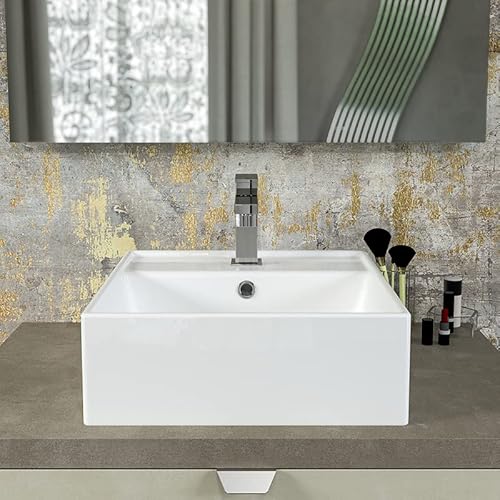ERCOS Lavabo D'Appoggio In Ceramica Quadrato, Lavabo Bagno Colore Bianco Lucido Con Troppopieno Integrato, Dimensioni 400X406 MM