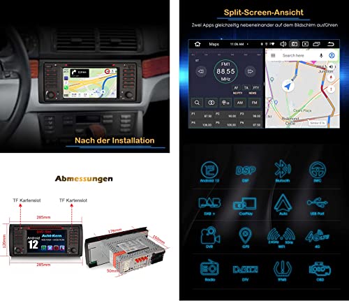 ✪【Android 12, 8-Core, 4GB+64GB】GPS 7 pollici DVD Autoradio per BMW Serie 5 E39 X5 M5 E53 con il potente sistema Android 12 di ultima generazione, è possibile godere di un'esperienza utente fluida e reattiva. Avvio rapido, touch screen capacitivo IPS. 2*A75+6*A55 architettura CPU 1800MHz a 64 bit. 2 schede/3 USB fino a 5*256GB di memoria estesa. L'amplificatore STMicroelectronics TDA7851 integrato supporta il subwoofer e un suono stereo da 4*48W.DVD, USB, TF, radio, RDS, orologio integrati.