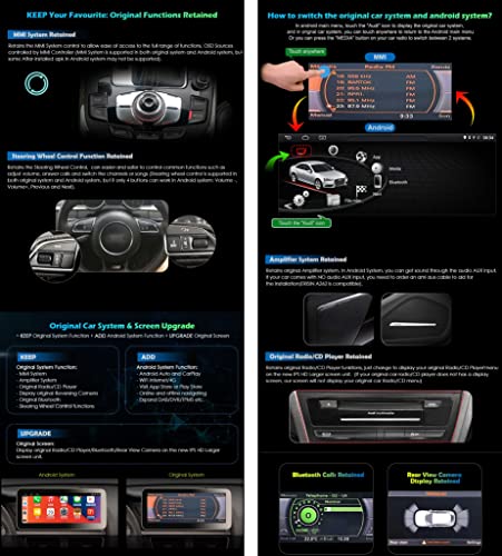 【Funzioni del sistema originale】 Questa autoradio Android conserva l'intera gamma di funzioni del sistema originale senza distruggere il cavo originale. Integra funzioni OEM centrate sul veicolo come sistema MMI, lettore CD, Bluetooth, radio, telecamera posteriore OEM, radar, sistema di amplificazione HiFi e controllo del volante. Supporta l'indicatore di informazioni sul veicolo originale, come olio residuo, temperatura esterna, tensione della batteria, avviso cintura di sicurezza, ecc.