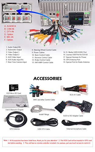Contenuto della confezione: 1 * Car Stereo, 1 * Manuale dell'utente in inglese, 1 * Cavo adattatore da AUDI a ISO, 1 * SWC e altri cavi di controllo, 1 * Cavo per microfono esterno, 1 * Cavo AV RCA, 1 * Cavo USB OTG, 1 * Antenna GPS, 1 * Installa raccordi, 1 * 8GB TF card