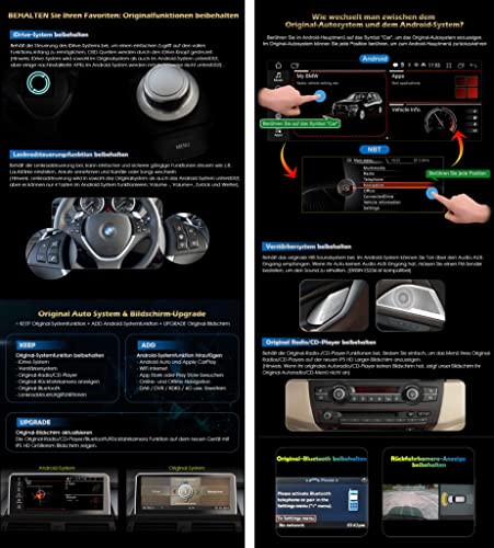 【Mantiene le funzioni del sistema originale】Questo dispositivo Android per auto mantiene l'intera gamma di funzioni del sistema originale, come il sistema iDrive, il lettore CD, il Bluetooth, la radio, la telecamera posteriore OEM, il radar, il sistema di amplificazione HiFi e il controllo del volante. Supporta l'indicatore di informazioni originali del veicolo, come l'olio residuo, la temperatura esterna, la tensione della batteria, l'avviso di cintura di sicurezza, il freno aperto, ecc.
