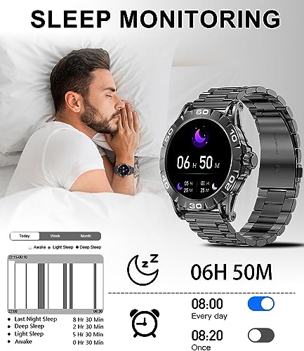 【Monitoraggio della Salute】Orologio fitness uomo è dotato di sensori di salute, in grado di monitorare con precisione gli indicatori di salute del corpo ininterrottamente, inclusi il monitoraggio della frequenza cardiaca, dell'ossigeno nel sangue e della pressione sanguigna. Include anche il monitoraggio del sonno (sonno profondo, sonno leggero e veglia) automaticamente durante il periodo compreso tra le 21:00-9:00, analizzati per aiutarti a comprendere appieno le tue condizioni di salute