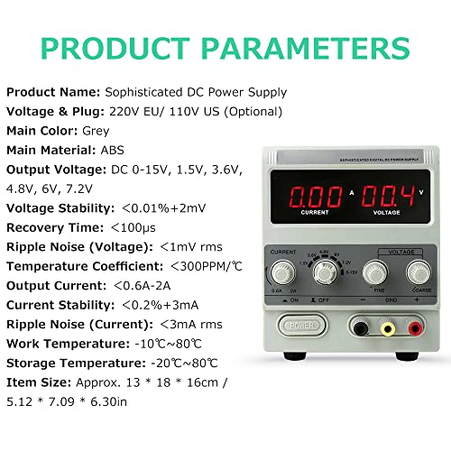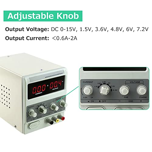 Manopole regolabili: le impostazioni di tensione e corrente rendono le impostazioni più precise e flessibili. Tensione di uscita: CC 0-15 V, 1,5 V, 3,6 V, 4,8 V, 6 V, 7,2 V;