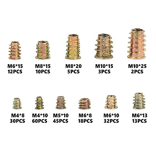 Diverse dimensioni di manicotti a vite: 11 misure: M4 x 8, M4 x 10, M5 x 10, M6 x 8, M6 x 13, M6 x 15, M8 x 15, M8 x 20, M10 x 15, M10 x 25, 230 pezzi in una scatola trasparente. soddisfare le diverse esigenze.