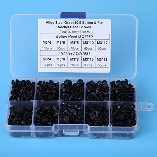 Viti a esagono incassato 720 pezzi M3 * 4/6/8/10/12 viti a esagono incassato a testa piatta in acciaio legato nero con scatola di plastica per mobili in legno