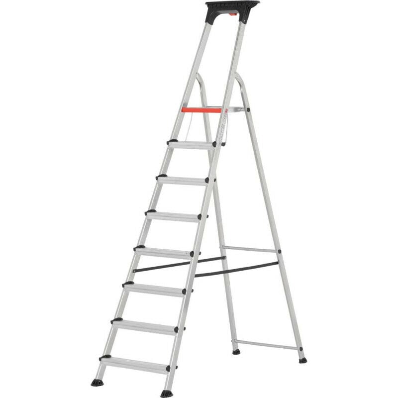 Stepladder ALU-PRO con piattaforma - Materiale: alluminio - Profondità gradino: 80 mm - Robusto gancio per benna: portata 10 kg - Vassoio in plastica - Dimensioni piattaforma: 250 x 250 mm - Carico massimo 150 kg - Con protezione antidivaricamento (cinghie in perlon ad alta resistenza)