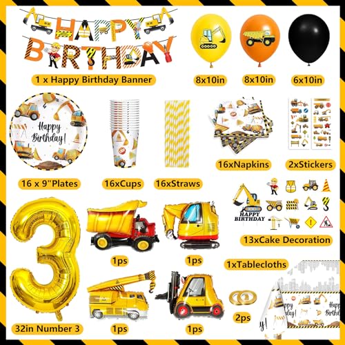 ️ Set di stoviglie per feste per bambini 3 anni, per cantiere, feste 16 piatti di carta da 9", 16 bicchieri da cantiere, 16 tovaglioli per escavatori, 16 cannucce, 1 tovaglia per feste con scavatore, 1 striscione Happy Birthday, 4 palloncini in pellicola (veicolo di ingegneria ed escavatore), 1 palloncino in alluminio da 32 pollici numero ''3", 22 x 10" palloncino di compleanno con escavatore (giallo, arancione, nero), 2 palloncini in alluminio x adesivi escavatori,13 decorazioni per torte, 2 ro