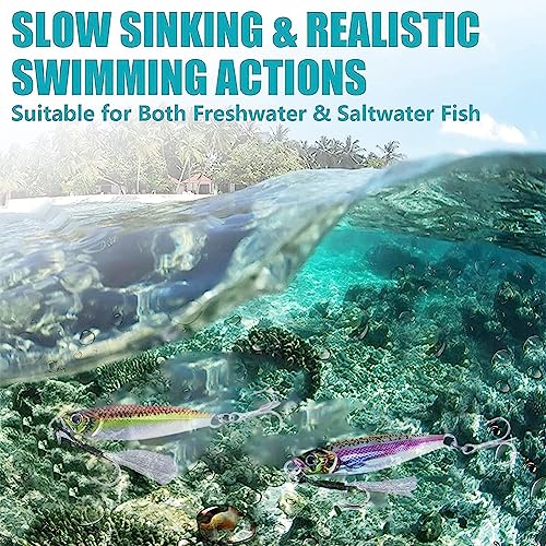 【Design realistico】 Il contorno naturale a forma di pesce con colori vivaci e occhi realistici in 3D, agisce vivido come la vita, attirando efficacemente i pesci affamati in acqua dolce e salata e innescandoli per attaccare. Il profilo affusolato, l'alto riflesso e il corpo dell'esca finemente lavorato possono attirare fortemente i banchi di pesci anche in condizioni di scarsa illuminazione e di notte e in acque profonde.