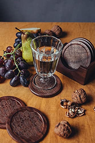 ESelam Sottobicchieri in noce per bicchieri, set da 6 pezzi, con incisione decorativa, sottobicchieri rotondi in legno con scatola di immagazzinaggio