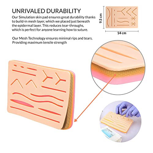 Cuscinetto durevole: il cuscinetto per suture durevole, riutilizzabile e di alta qualità è progettato per replicare la struttura anatomica del tessuto umano con 3 strati di diversa densità e una rete incorporata, il che lo rende incredibilmente simile all'anatomia e durevole da suturare.