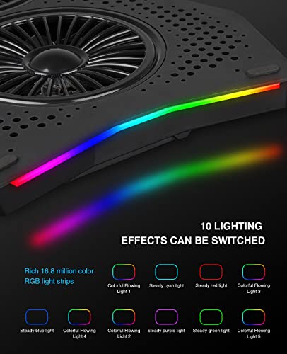 【10 modalità di illuminazione RGB] sono presenti barre luminose RGB estese su entrambi i lati della ventola del laptop. Dopo che il pad di raffreddamento è acceso, può distribuire un fantastico effetto di illuminazione RGB. Contiene 10 tipi di illuminazione con efficacia speciale, puoi scegliere la luce di respirazione a colori o la modalità di luce di respirazione monocromatica in base alle tue preferenze.