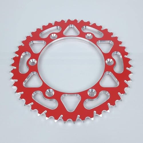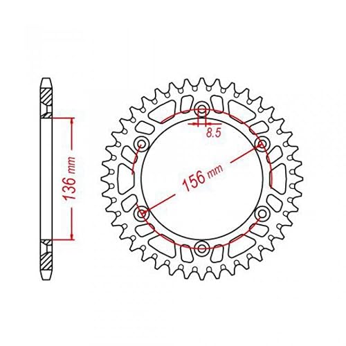Corona di trasmissione antifango di 48 denti al passo 520 nuova, in alluminio colore rosso, marca Esjot.Dimensioni: - Numero di denti: 48.- Passo 520.- Diametro interno: 136 mm. Spessore: 6 mm. Numero di fori: 6. Diametro dei fori: 8,5 mm. - Tra asse dei fori: 156 mm. - Portata: nessuna. Venduta al unità.Viene fornito come da foto.
