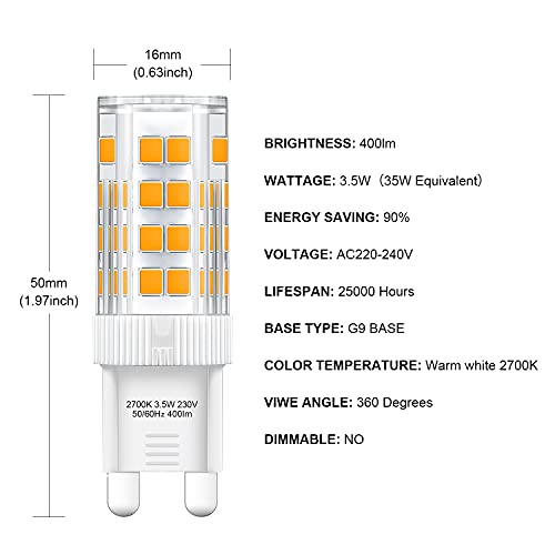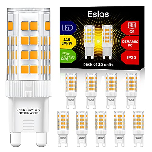 Eslas G9 3.5 W lampadine LED (330LM, 35 W alogena equivalente),2700 K bianco caldo,AC 220 - 240 V,90% risparmio energetico[classe di efficienza energetica A +](Warm White 3.5w, Pack of 10)