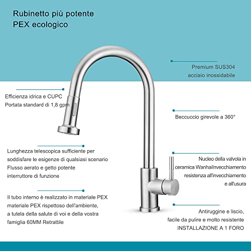 【Unico-Design e Creatività】La testa estensibile dello spruzzo può essere ruotata di 360 °, è un rubinetto da cucina ad arco ad alto manico e ha due modalità di spruzzo d'acqua, una è una modalità di flusso, l'altra è una modalità di spruzzo, la testa dello spruzzo può essere ritratta liberamente e la più lunga può essere allungata fino a 60 cm. La bocca del rubinetto ha un filtro di rete che può drenare acqua più pulita e più chiara e ridurre gli spruzzi d'acqua.