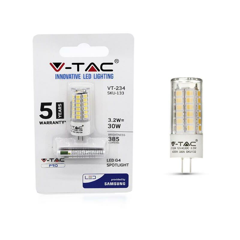 LED Faretto SAMSUNG Chip G4 3.2W Plastica 4000K SKU: 132: VT: VT-234 Caratteristiche del prodotto 80% di consumo energetico in meno rispetto alle lampadine standard Lunga durata Nessuna emissione di radiazioni UV e radiazioni non ionizzanti Accensione immediata, nessun tempo di riscaldamento Bassa potenza termica Direttamente sostituibile alle lampade ad incandescenza tradizionali Installazione Aree Commerciali e Residenziali Hotel, Bar Stand espositivi Lampadari Allaperto, esclusivamente allinterno di apparecchi idonei. Specifiche tecniche Informazione generale Attacco G4 Tipo Lampadina T16 Tipo LED SAMSUNG Chip Vitamedia 30000 ore Dati elettrici Potenza 3.2W Tensione AC: 220-240V Frequenza 50Hz Fattore di potenza 50Hz Dati tecnici luce Fascio Luminoso 300° Efficienza luminosa (lm/W) 120 lm/W Colore della luce Bianco naturale Temperatura di colore 4000K Flusso luminoso (lm) 385 lm Indice di resa cromatica Ra >80 Dettagli corpo Materiale Plastica Funzionalità IP Protezione IP20 Tempo