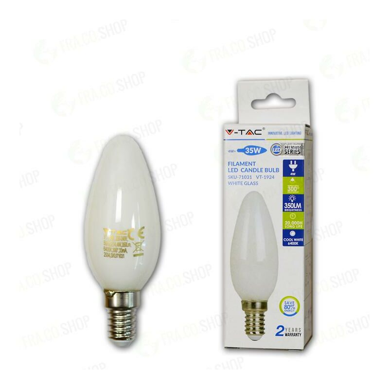 Lampadina LED - 4W Filament E14 Bianca Candela 6400K SKU: 7103: VT: VT-1924 Caratteristiche del prodotto 80% di consumo energetico in meno rispetto alle lampadine standard Lunga durata Nessuna emissione di radiazioni UV e radiazioni non ionizzanti Accensione immediata, nessun tempo di riscaldamento Bassa potenza termica Direttamente sostituibile alle lampade ad incandescenza tradizionali Installazione Aree Commerciali e Residenziali Hotel, Bar Stand espositivi Lampadari Allaperto, esclusivamente allinterno di apparecchi idonei. Specifiche tecniche Informazione generale Attacco E14 Tipo Lampadina Candela Tipo LED Filament Vita media 20 000h Dati elettrici Potenza 4W Potenza EQV. a incandescenza 35W Tensione AC: 220-240V Frequenza 50Hz Fattore di potenza >0.4 Dati tecnici Luce Colore della luce Bianco Temperatura di colore 6400K Flusso luminoso 350 lm Indice di resa cromatica Ra >80 Fascio Luminoso 300° Dettagli corpo Materiale Vetro Colore Bianco Funzionalità Dimmerabile No IP