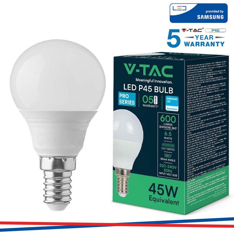 LED Lampadina SAMSUNG Chip 6.5W E14 P45 Plastica 4000K SKU: 21864: VT: VT-270 Specifiche tecniche Informazione generale Attacco E14 Tipo Lampadina P45 Tipo LED SMD Samsung Chip Vitamedia 20,000 ore Dati elettrici Potenza 6.5W Potenza EQV. a incandescenza 45W Tensione AC:220-240V Frequenza 50Hz Dati tecnici luce Fascio Luminoso° 180° Colore della luce Bianco naturale Temperatura di colore 4000K Flusso luminoso (lm) 600 lm Indice di resa cromatica Ra >80 Dettagli corpo Materiale Termoplastico Funzionalità IP Protezione IP20 Tempo innesco 100% 0.001 secondo Stabilità del colore Numero cicli accensione / spegnimento >20000 Condizioni di lavoro -20°C to +45°C Fattore manten. flus lum fine durata nom 70% Dimensione Dimensioni 45 x 80mm Altezza 80 mm Diametro 45 mm Dati del prodotto Numero dordine 21864 Numero di prodotto VT-270 Pezzi per confezione 1 Peso 0.03 Codice EAN 3800157698658 Certificati e norme Classe di efficienza energetica F Aggiuntivo Data di rilascio 30.03.2023 Marchio V-TAC