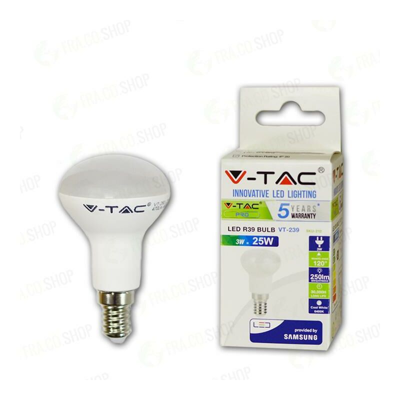 LED Lampadina - SAMSUNG CHIP 3W E14 R39 Plastica 6400K SKU: 212: VT: VT-239 Caratteristiche del prodotto 80% di consumo energetico in meno rispetto alle lampadine standard Lunga durata Nessuna emissione di radiazioni UV e radiazioni non ionizzanti Accensione immediata, nessun tempo di riscaldamento Bassa potenza termica Direttamente sostituibile alle lampade ad incandescenza tradizionali Installazione Aree Commerciali e Residenziali Hotel, Bar Stand espositivi Lampadari Allaperto, esclusivamente allinterno di apparecchi idonei. Specifiche tecniche Informazione generale Attacco E14 Tipo Lampadina R39 Tipo LED SAMSUNG Chip Vita media 30 000 h Dati elettrici Potenza 3W Potenza EQV. a incandescenza 25W Tensione AC: 220-240V Frequenza 50Hz Fattore di potenza >0.4 Dati tecnici Luce Colore della luce Bianco Temperatura di colore 6400K Flusso luminoso 250 lm Indice di resa cromatica Ra >80 Fascio Luminoso 120° Dettagli corpo Materiale Termoplastico Colore Bianco Funzionalità Dimmerabile No