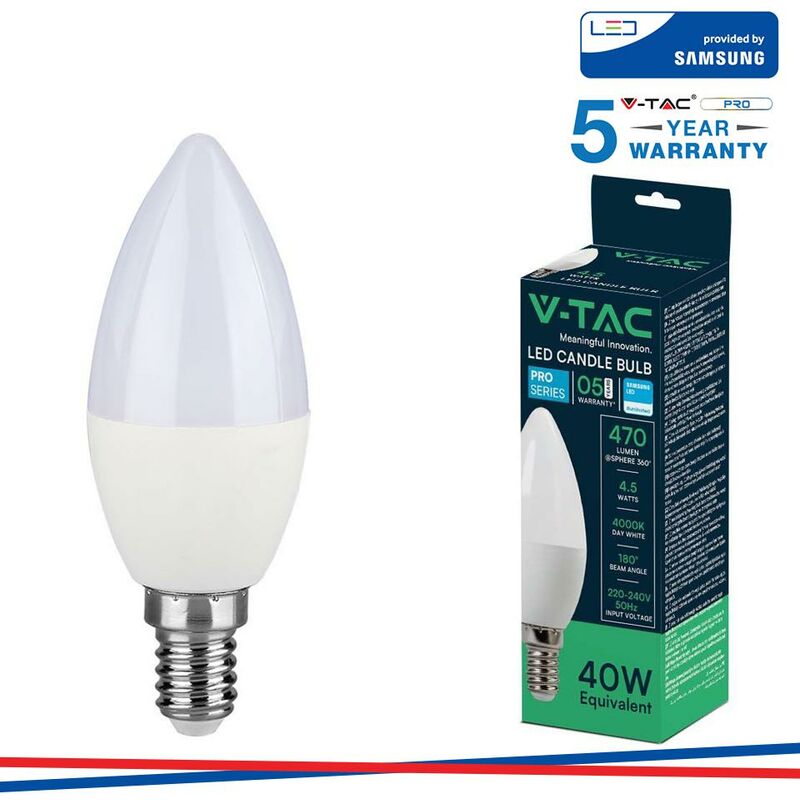 LED Lampadina SAMSUNG Chip 4.5W E14 Plastica Candela 4000K SKU: 21172: VT: VT-226 Caratteristiche del prodotto 80% di consumo energetico in meno rispetto alle lampadine standard Lunga durata Nessuna emissione di radiazioni UV e radiazioni non ionizzanti Accensione immediata, nessun tempo di riscaldamento Bassa potenza termica Direttamente sostituibile alle lampade ad incandescenza tradizionali Installazione Aree Commerciali e Residenziali Hotel, Bar Stand espositivi Lampadari Allaperto, esclusivamente allinterno di apparecchi idonei. Specifiche tecniche Informazione generale Attacco E14 Tipo Lampadina Candela Tipo LED SMD Samsung Chip Vitamedia 20,000 ore Dati elettrici Potenza 4.5W Potenza EQV. a incandescenza 40W Tensione AC:220-240V Frequenza 50Hz Dati tecnici luce Fascio Luminoso° 180° Colore della luce Bianco naturale Temperatura di colore 4000K Flusso luminoso (lm) 470 lm Indice di resa cromatica Ra >80 Dettagli corpo Materiale Termoplastico Funzionalità IP Protezione IP20
