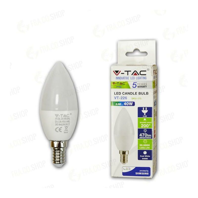 Lampadina LED - SAMSUNG Chip 5.5W E14 Plastica Candle Luce Bianca SKU: 173: VT: VT-226 Caratteristiche del prodotto 80% di consumo energetico in meno rispetto alle lampadine standard Lunga durata Nessuna emissione di radiazioni UV e radiazioni non ionizzanti Accensione immediata, nessun tempo di riscaldamento Bassa potenza termica Direttamente sostituibile alle lampade ad incandescenza tradizionali Installazione Aree Commerciali e Residenziali Hotel, Bar Stand espositivi Lampadari Allaperto, esclusivamente allinterno di apparecchi idonei. Specifiche tecniche Informazione generale Attacco E14 Tipo Lampadina Candle Tipo LED SAMSUNG Chip Vita media 30 000 h Dati elettrici Potenza 5.5W Potenza EQV. a incandescenza 40W Tensione AC: 220-240V Frequenza 50Hz Fattore di potenza >0.5 Dati tecnici Luce Colore della luce Bianco Temperatura di colore 6400K Flusso luminoso 470 lm Indice di resa cromatica Ra >80 Fascio Luminoso 200 ° Dettagli corpo Materiale Termoplastico Colore Bianco Funzionalità