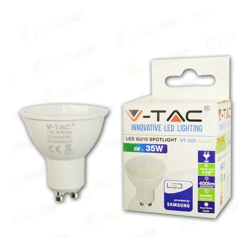 LED Lampadina SAMSUNG Chip GU10 5W Smooth Plastica 110'D 4000K SKU: 202: VT: VT-205 Caratteristiche del prodotto 80% di consumo energetico in meno rispetto alle lampadine standard Lunga durata Nessuna emissione di radiazioni UV e radiazioni non ionizzanti Accensione immediata, nessun tempo di riscaldamento Bassa potenza termica Direttamente sostituibile alle lampade ad incandescenza tradizionali Installazione Aree Commerciali e Residenziali Hotel, Bar Stand espositivi Lampadari Allaperto, esclusivamente allinterno di apparecchi idonei. Specifiche tecniche Informazione generale Attacco GU10 Tipo Lampadina PAR16 Tipo LED SAMSUNG Chip Vitamedia 30000 ore Dati elettrici Potenza 5W Potenza EQV. a incandescenza 35W Tensione AC: 220-240V Frequenza 50Hz Fattore di potenza 50Hz Dati tecnici luce Fascio Luminoso 110° Colore della luce Bianco naturale Temperatura di colore 4000K Flusso luminoso (lm) 400 lm Indice di resa cromatica Ra >80 Dettagli corpo Materiale Plastica Funzionalità IP