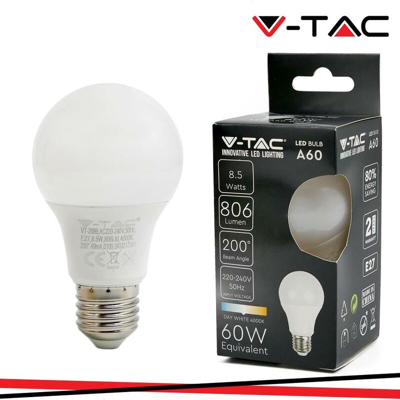LED Lampadina 8.5W E27 A60 ThermoPlastica 4000K SKU: 217261: VT: VT-2099 Caratteristiche del prodotto 80% di consumo energetico in meno rispetto alle lampadine standard Lunga durata Nessuna emissione di radiazioni UV e radiazioni non ionizzanti Accensione immediata, nessun tempo di riscaldamento Bassa potenza termica Direttamente sostituibile alle lampade ad incandescenza tradizionali Installazione Aree Commerciali e Residenziali Hotel, Bar Stand espositivi Lampadari Allaperto, esclusivamente allinterno di apparecchi idonei. Specifiche tecniche Informazione generale Attacco E27 Tipo Lampadina A60 Tipo LED SMD Vitamedia 20,000 ore Dati elettrici Potenza 8.5W Potenza EQV. a incandescenza 60W Tensione AC: 220-240V Frequenza 50Hz Fattore di potenza >0.5 Dati tecnici luce Fascio Luminoso° 200° Colore della luce Bianco naturale Temperatura di colore 4000K Flusso luminoso (lm) 806 lm Indice di resa cromatica Ra >80 Dettagli corpo Materiale Termoplastico Funzionalità IP Protezione IP20 Tempo