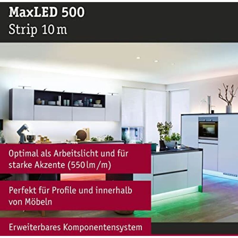 Dettagli tecnici Caratteristiche striscia LED autoadesiva, accorciabile Collegamento (striscia LED) con spina Colore Argento Colore luce RGBW Dimensione del prodotto, larghezza 12.5 mm Dimensione del prodotto, lunghezza 10 m Dimensioni (L x L x A) 10 m x 12.5 mm x 2.5 mm Dimensioni prodotto Altezza 2.5 mm Famiglia colore Grigio Flusso luminoso per fonte di luce (lumen) 16.7 lm Materiale Plastica Numero di LED (Dettagli) 300 Numero di LED per unità 3 Numero di lampadine 300 Peso 600 g Potenza 72 W Tensione di funzionamento 24 V Tipo prodotto Espansione striscia LED Utilizzo (illuminazione) Interno/esterno temperatura colore max. 3000 K MaxLED 500 RGBW Strip incl. Cavo adattatore da 10 m con funzione di cambio colore non rivestito Le strisce MaxLED sono talmente potenti che possono essere utilizzate senza problemi per illuminare la stanza. Grazie alla suggestiva funzione di cambio colore, è possibile creare un ambiente di vita personalizzato, dall'illuminazione continua a un colore fino