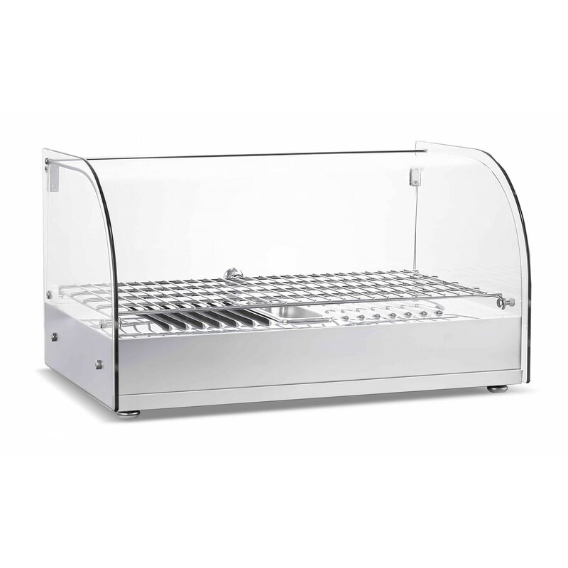 Splendida Vetrinetta da banco riscaldata totalmente in acciaio inox e vetro, perfetta per mantenere al caldo panini, pizzette, cibi fritti e cucinati. La temperatura è regolabile tra +30°C e +90°C attraverso una manopola. E' dotata di 1 griglia cromata non regolabile. E' presente 1 porta battente sul lato utente.