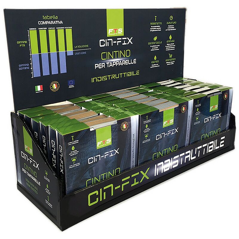 In display da banco. composizione: 6 cintini per tipo da mt.7,5 in pvc, larghezza mm 22, rispettivamente nei colori bianco, grigio e avana.18 pezzi