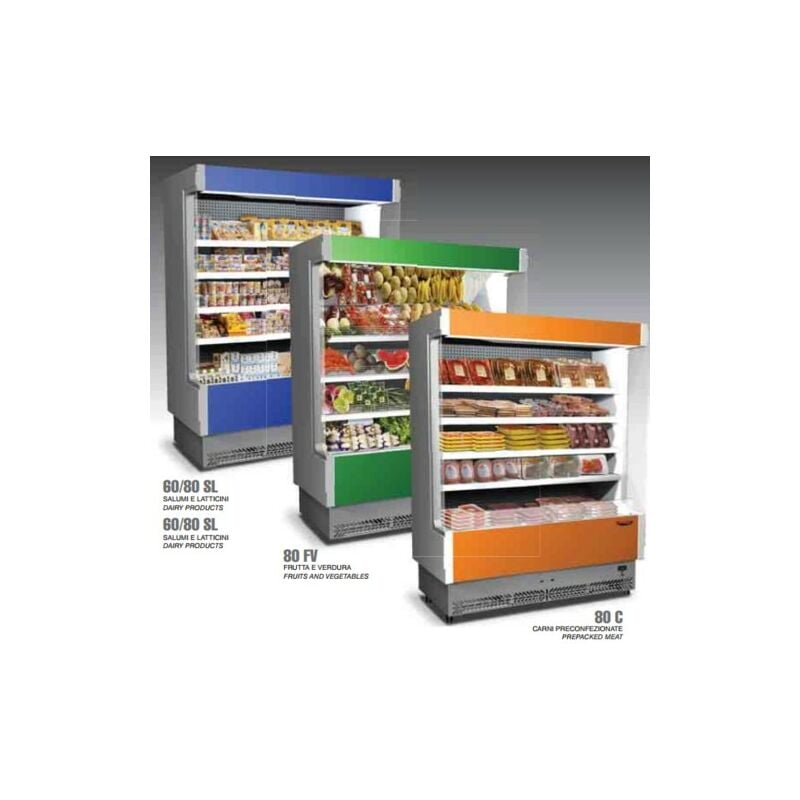 Codice RS9364 - Frigorifero murale ventilato per salumi e latticini, modello TD-VULCANO SL80CG-200, dimensioni cm. 208x80x204 (lxpxh). N.4 ripiani in lamiera bianca atossica regolabili in altezza, profondità cm. 38, dotati di porta prezzo. Temperatura di esercizio +3/+5 °C, 230 volt, 2660 watt. Spalle termoformate e coibentate (spessore 40 mm cad.) con fianco in vetro temperato. Pannello comandi elettronico. Sbrinamento a fermata con vasca di raccolta condensa e sistema di evaporazione automatica. Illuminazione superiore con lampada a neon. Tenda notte autoavvolgente manuale. Compatto ma con un'ampia superficie espositiva. Adatto a piccola, media e grande distribuzione. Tecnologia, design e produzione Made in Italy. Facilità d'installazione. Ottimizzazione del sistema di pulizia. Basso consumo energetico. Basso impatto ambientale. Vasca realizzata senza l'uso di CFC. Refrigerazione ventilata. Disponibile nelle seguenti colorazioni (specificare in fase d'ordine): Blu (RAL 5013), Verde