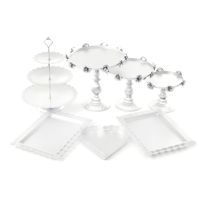 Caratteristiche:Materiale: ferroIl pacchetto include:1 alzata per torta a 3 livelli1 x piatto a forma di cuore2 x piatto rettangolare3 x torta alta supporto(escluse altre decorazioni)