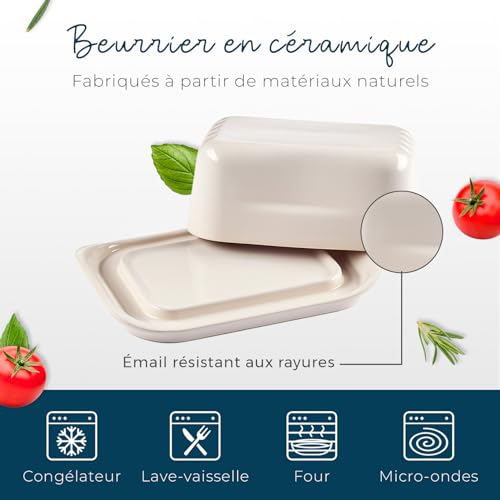 ELEGANZA PRATICA: Aggiungi un tocco di eleganza alla tua tavola con la nostra scatola per burro in ceramica. Mantiene la freschezza grazie alla sua inerzia termica. Il colore ecru si armonizza con tutti gli stili di stoviglie.