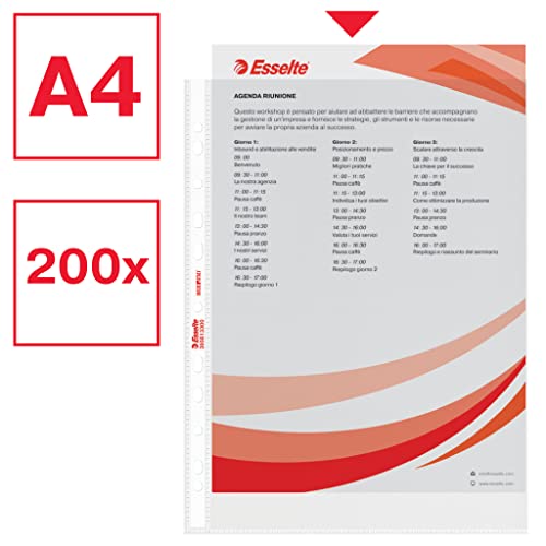 Esselte Buste Perforate Standard, in PPL Antiriflesso, per Archiviare e Conservare Documenti in Formato A4, Confezione da 200 Buste, 395613300