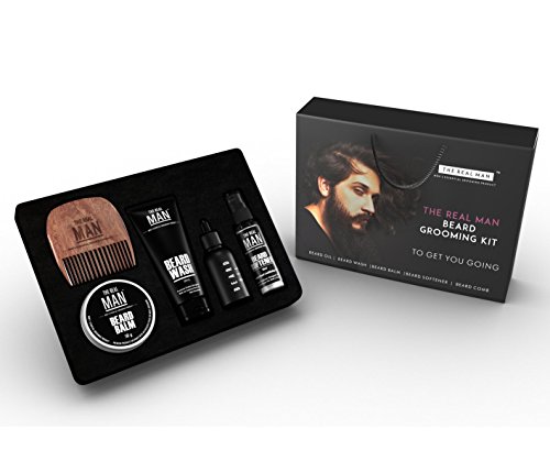 Essential Beard Grooming kit by The Real Man. Un olio da barba (28,6 gram), lavare (47,9 gram), ammorbidente (28,6 gram), balsamo (50g) e pettine (25g) Set per gli uomini. Appositamente progettato per la barba da uomo degli Stati Uniti.