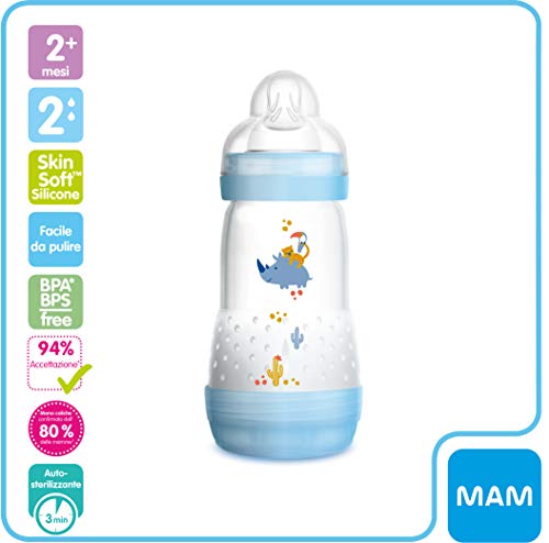 Contenuto e dettagli - Essential Bottle Set: 2x biberon Anti-Colic (260ml), 2x Impugnatura biberon Anti-Colic (320ml), 2x tettarelle mis. 3 e 2x X,4+ mesi, blu, articolo numero MAM5B, bimbo