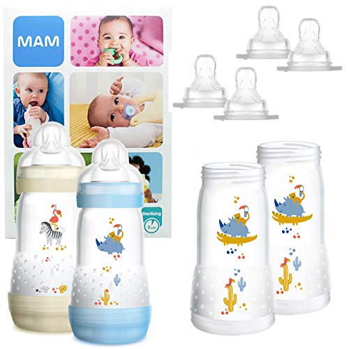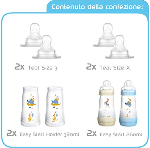 MAM Essential Bottle Set, Accessori bimbi con 2x Biberon Anti-Colic (260ml) e 2x Holder biberon anticolica (320ml), Biberon neonato con 4x tettarella mis. 3 e X per 6+ mesi, Bimbo
