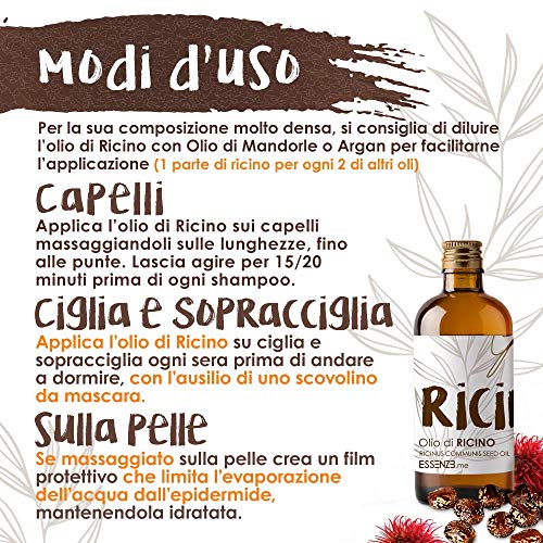 ESSENZE OLIO DI RICINO 100ml Puro al 100% Naturale Castor Oil, Pressato a Freddo, Nutriente per Capelli, Corpo, Ciglia e Sopracciglia, Viso, Barba. Controllato e Confezionato in ITALIA