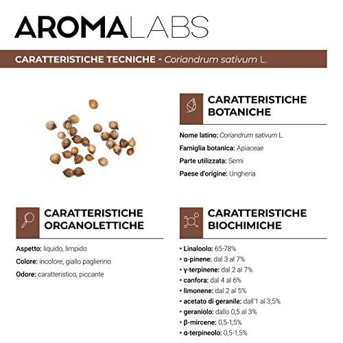 BIO - Olio essenziale Semi Di Coriandolo - 10mL - 100% Puro, Naturale, Chemiotipizzato e Certificato AB - Aroma Labs (Marchio Francese)