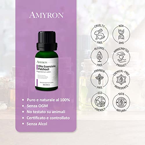 Olio essenziale di patchouli AMYRON naturale e puro al 100%: un prodotto di qualità superiore con il marchio AMYRON, garanzia di eccellenza.
