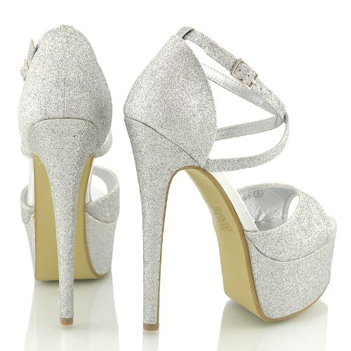 ESSEX GLAM Sandalo Donna Peep Toe con Lacci Plateau Tacco a Spillo Alto (UK 7 / EU 40 / US 9, Argento Glitter)