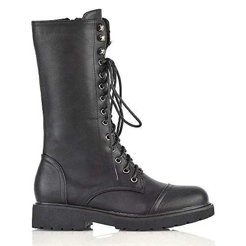 ESSEX GLAM Stivali Donna Metà Polpaccio Nero Pelle Sintetica Allacciare Cerniera Tacco Basso Combattere Scarpe EU 40