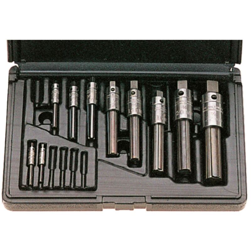 Set di esposizione per il trapano a filo con 4 scanalature per la scoperta del trapano a tocco rotto • Applicazione: per disattivare il trapano a filo rotto. Spostando il supporto, le dita vengono inserite nei rubinetti e fissate con la presa guida. Con l'aiuto di un ferro da stiro, il rubinetto rotto viene allentato e avvitato. • Esecuzione: estrattore con 3 scanalature in acciaio e dito in acciaio a molla. 10 parti (composta da 13512) • Vantaggio: la rimozione intuitiva e razionale dei tocche consente di risparmiare tempo e costi