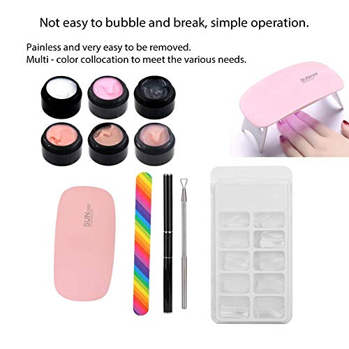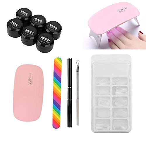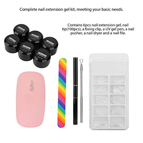 Contiene gel di estensione per unghie 6 pezzi, punta per unghie (100 pezzi), una clip di fissaggio, una penna gel UV, uno spintore per unghie, un essiccatore per unghie e una lima per unghie.