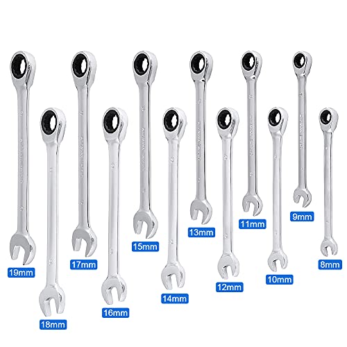 Set di chiavi a cricchetto da 12 pezzi: Queste chiavi sono disponibili in misure metriche tra cui 8mm, 9mm, 10mm, 11mm, 12mm, 13mm, 14mm, 15mm, 16mm, 17mm, 18mm e 19mm, dimensioni continue da 8-19mm per soddisfare la maggior parte delle tue esigenze.