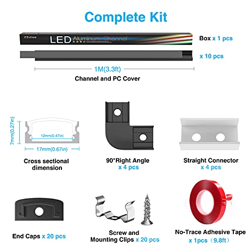 【Facile installazione】 L'adesivo 3M serve per pulire e liberare le fessure. Adatto per montaggio a parete liscio di vetro, armadi in legno, piastrelle in ceramica, ecc. I supporti in metallo sono adatti per l'installazione all'aperto o su pareti irregolari. Contenuto della confezione: 10 canali in alluminio da 1 m e paralume in policarbonato, 4 angoli a U a 90° a destra, 4 connettori, 1 nastro adesivo senza tracce (9,8 ft), 20 coperture terminali, 20 clip di montaggio e 20 viti complete. (strisce LED non incluse)