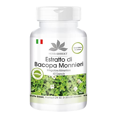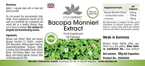 Estratto di Bacopa Monnieri 500mg in capsule - 60 capsule - Contiene 20% di bacoside - Per il miglioramento della funzione cognitivo | HERBADIREKT by Warnke Vitalstoffe
