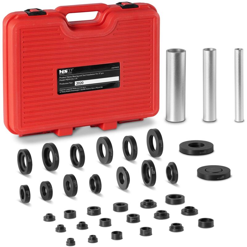 Set estrattori cuscinetti e guarnizioni MSW-CA-119 di MSW Gli anelli di spinta in nylon sono estremamente resistenti e trasmettono la forza in modo omogeneo sul cuscinetto. Con la giusta combinazione di tubi a percussione e anelli di spinta sei sicuro che la forza di montaggio non verrà mai trasmessa attraverso gli elementi volventi del cuscinetto. Quindi durante il montaggio non avviene un contatto di metallo su metallo, mentre gli assi, l'alloggiamento e le guarnizioni del cuscinetto non vengono danneggiati. Nella spedizione sono compresi tasselli di spinta per diametri da 10 a 90 mm e due rondelle con dimensioni 45 - 100 mm e 50 - 110 mm. I tre tubi a percussione in alluminio legato sono estremamente resistenti e ti offrono tutte le possibilità di montaggio dei cuscinetti. La pressione avviene con un martello senza contraccolpo (non incluso nella spedizione). Dettagli tecnici Materiale tasselli di spinta Nylon Materiale tubo a percussione Lega di alluminio Dimensioni tasselli di