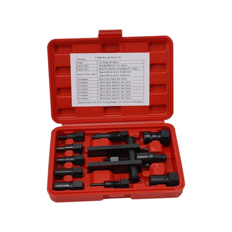 Set di estrattori a ponte per cuscinetti da 10 pezzi. Dotato di 7 espansori a settori per interni da 8 a 25 mm da utilizzare in combinazione con il ponte. Manovrando la vite di regolazione, si fa presa sull'estremità opposta del pezzo da estrarre (cuscinetto, bronzina, bussola, camicia....) attraverso l'espansione dei settori. I sottili labbri degli espansori assicurano una presa sicura sulla superficie curva del foro interno del cuscinetto. Permette di rimuovere delicatamente i cuscinetti ciechi dove l'uso di un martello scorrevole potrebbe danneggiare il materiale circostante. Caratteristiche tecniche: Diametro: 8 - 12 - 18 - 16 - 25mm La confezione contiene: Nr. 1 Set estrattore per cuscinetti