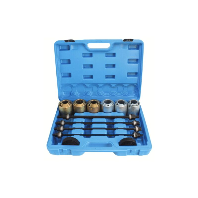 KIT ESTRATTORE RIMOZIONE BOCCOLE BLOCCHI SILENZIOSI ESTRATTORI SILENT BLOCK 809s Il set di kit di manicotti di trazione e pressione con mandrini e dadi di trazione è progettato per la rimozione e l'installazione di boccole, cuscinetti e guarnizioni L'intero set di strumenti è con applicazione completamente universale per auto, LGV o HGV E' adatto a cuscinetti silenziosi, cuscinetti idraulici, boccole per cuscinetti, cuscinetti a sfere, guarnizioni per alberi, cuscinetti in gomma, ecc. È anche compatibile con le presse da officina Questo set di strumenti viene fornito completo di 20 manicotti a pressione e 4 mandrini e dadi di trazione Diametro interno: 34 mm - 72 m Diametro esterno: 44 mm - 82 mm Mandrini e dadi di trazione: M10, M12, M14, M16