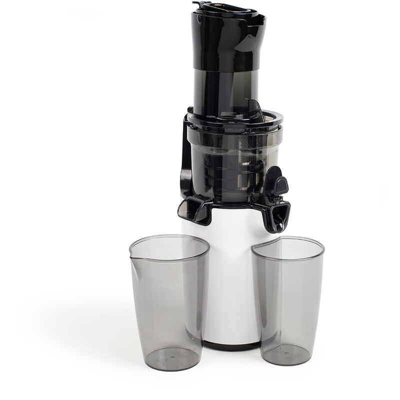 Camino largo 78 mm - Filtro in acciaio inox - Sistema a vite senza fine a rotazione lenta - Funzione reverse per sciogliere il cibo durante l'estrazione - Beccuccio versatore con patta di chiusura per servire al bicchiere - Sistema antigoccia - 2 serbatoi polpa da 0,8 L e succo da 0,6 L - Spazzola per la pulizia inclusa